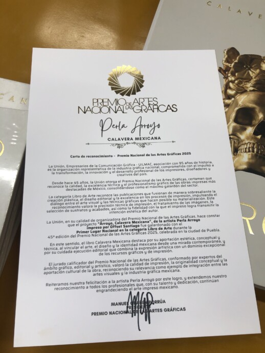 El proyecto editorial ARROYO, Calavera Mexicana, de la artista Perla Arroyo, fue distinguido con el Primer Lugar en la categoría “Libro de Arte” en la 45ª edición del Premio Nacional de las Artes Gráficas 2025, uno de los reconocimientos más importantes del país en el ámbito del diseño, la producción editorial y las artes gráficas.